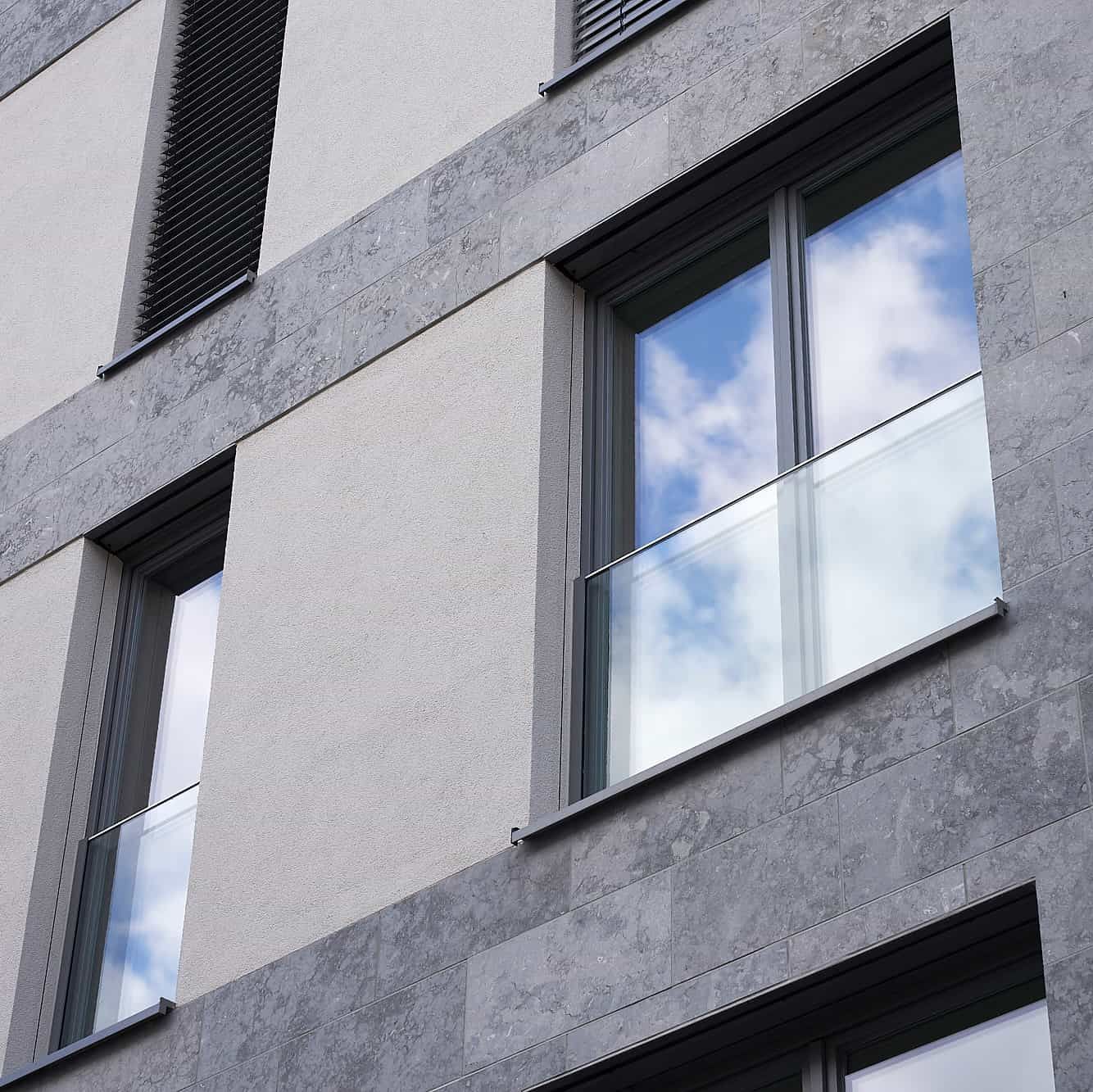 La protection anti-chute en verre transparent, presque invisible, permet de rendre la visière extérieure bien visible sans nuire à l’aspect harmonieux du mur extérieur.